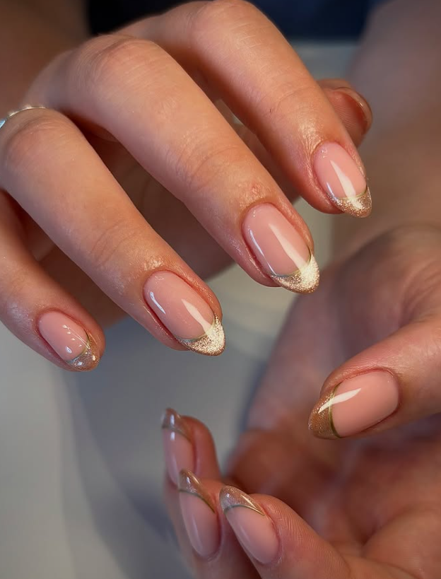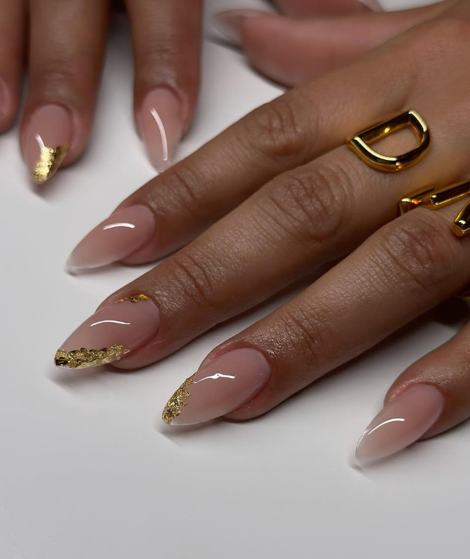 Gold foil nails are stylish and artistic. Small pieces of gold foil placed on neutral or dark nails create a beautiful textured effect.