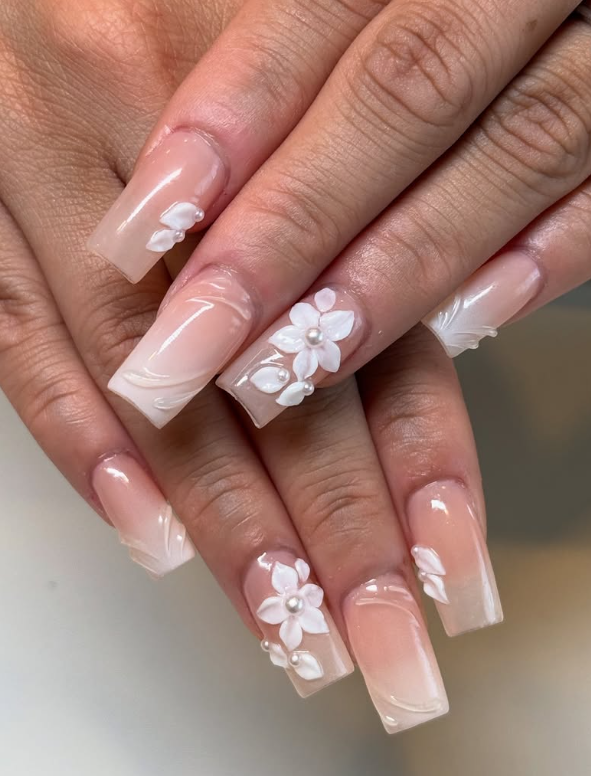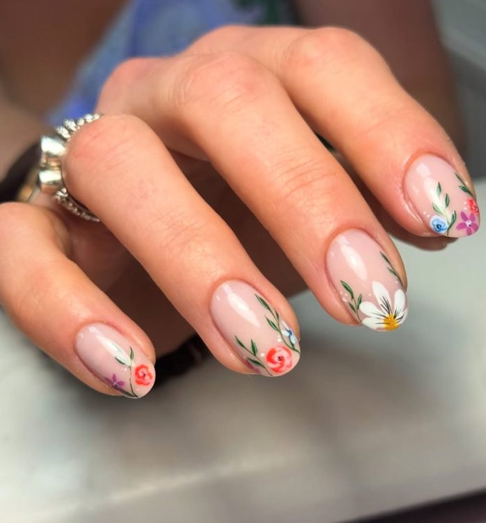 Tiny flowers painted on a nude or pastel base create a soft and feminine look. Some designs even include small 3D flowers or tiny pearls for extra detail.