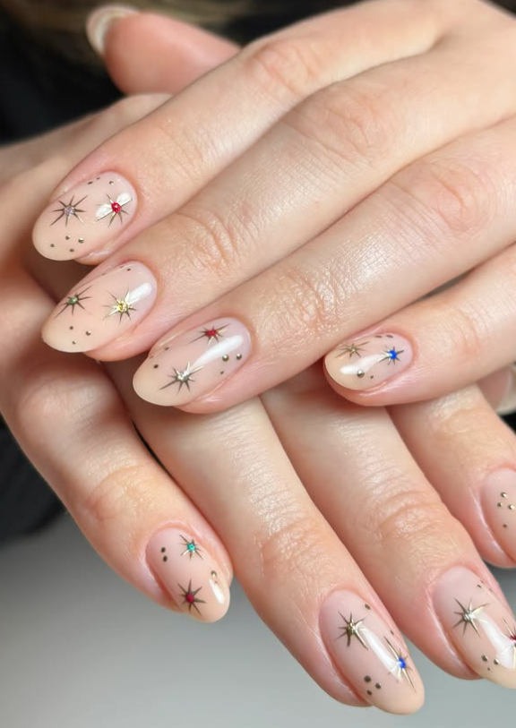 These nails usually feature a dark base like navy or black with tiny stars, moons, and sparkles. Some designs even include small crystals to create a galaxy effect.