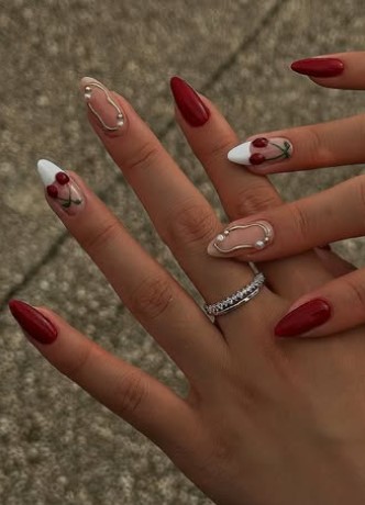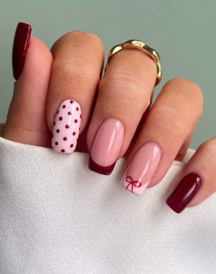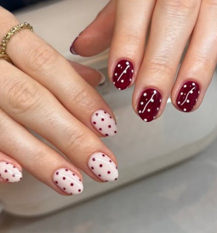 Small white hearts or lines on red nails add contrast while keeping the look soft and romantic.