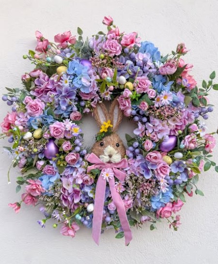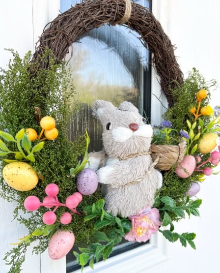 A pastel ribbon wreath is a bright and elegant decoration for your front door. It can be made using ribbons in soft colors like pink, lavender, mint green, and baby blue. The flowing ribbons create a light and cheerful spring look. Adding small flowers or decorative eggs makes the wreath even more festive. This wreath brings a fresh seasonal style to your entryway.