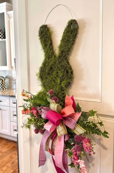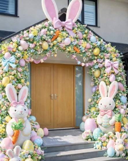A bunny-shaped door hanger adds a playful touch to your entryway. Wooden or fabric bunny signs look especially cute on front doors. Many designs also include ribbons, flowers, or pastel colors. This decoration is simple but very eye-catching. It instantly shows your Easter spirit.