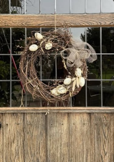 A rustic farmhouse wreath gives your Easter decor a cozy and natural touch. These wreaths often include twigs, greenery, burlap ribbons, and small decorative eggs. Neutral colors and natural textures make the design feel warm and inviting. This style works beautifully with farmhouse or country-themed homes. It’s a simple yet stylish way to decorate your door for Easter.